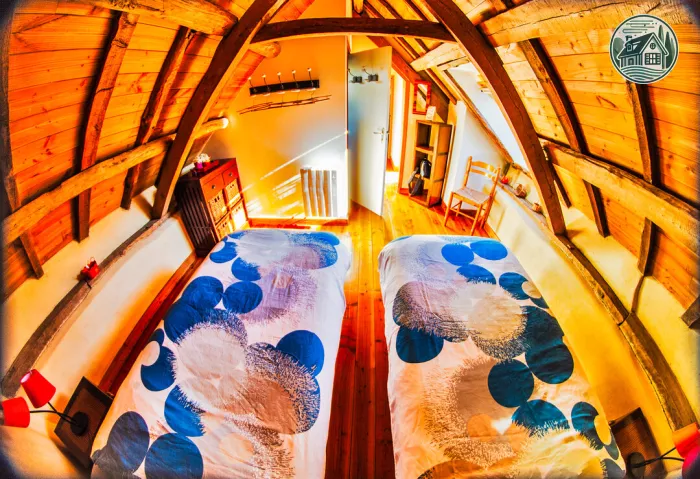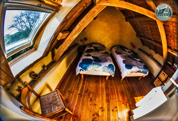 Notre chambre Menez Hom se trouve à l'étage de Rezkibilou, sous la charpente, parfaite pour une escapade bucolique. C'est une chambre avec deux lits simples. Elle a sa salle de bain privée, les toilettes sont partagés avec la chambre voisine, Tuchenn Kador.